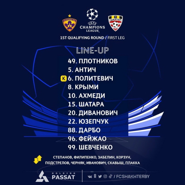 ШАХТЕР: Плотников — Шевченко, Шатара, Политиевич (к), Антич — Юзепчук, Диванович, Крыми, Ахмеди, Фейжао — Дарбо.